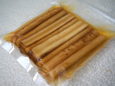 ごぼうを醤油・酢・砂糖で漬け込みました。