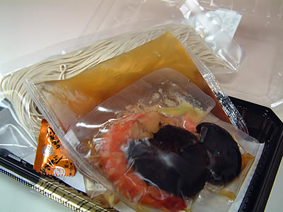 [原材料] つゆ(醤油、さば、うるめ、目近、昆布、砂糖、味醂)、麺(小麦粉、そば粉) 味付椎茸(醤油、砂糖)、海老、生麩(小麦グルテン、餅粉、着色料(赤3、赤106、赤102、黄4、青1)七味唐辛子、【原材料の一部に小麦、大豆、海老、ゴマを含む】