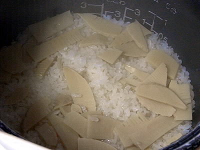炊飯器での炊きあがり画像が.1.5合分どすさかい、竹の子が入ってる量の目安にしとくれやす(混ぜる前の画像どす)