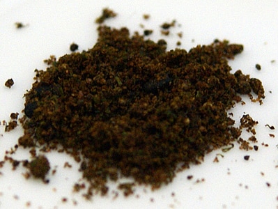 普通の七味が赤いのに黒七味が黒っぽいのは、手間ひまをかけて原材料をもみ込む事により原料の油分が出て来る事によるとか。