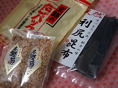 [原材料] かつおぶし(かつおの枯れ節ぶし)、だしぱっく(いわしのふし、さばのふし)利尻昆布