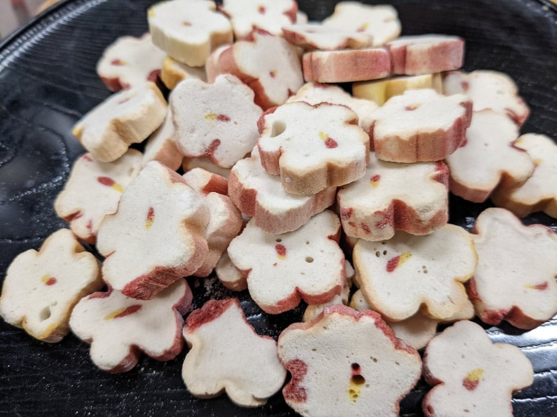 [原材料] 小麦粉(小麦(国産))、小麦たんぱく/紅麹色素、クチナシ黄色素(一部に小麦を含む)