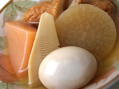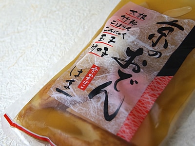 [原材料] 大根、卵、コンニャク、ごぼう天(魚肉(たら、いとより)牛蒡)澱粉、砂糖、食塩、ぶどう糖、植物油)、ちくわ(魚肉(たら)、澱粉、食塩、砂糖、ぶどう糖)、竹の子、白だし、発酵調味料、醤油、食塩、魚醤、調味料(アミノ酸等)、酸味料、凝固剤(水酸化カルシュウム)、※原材料の一部に卵、小麦を含む